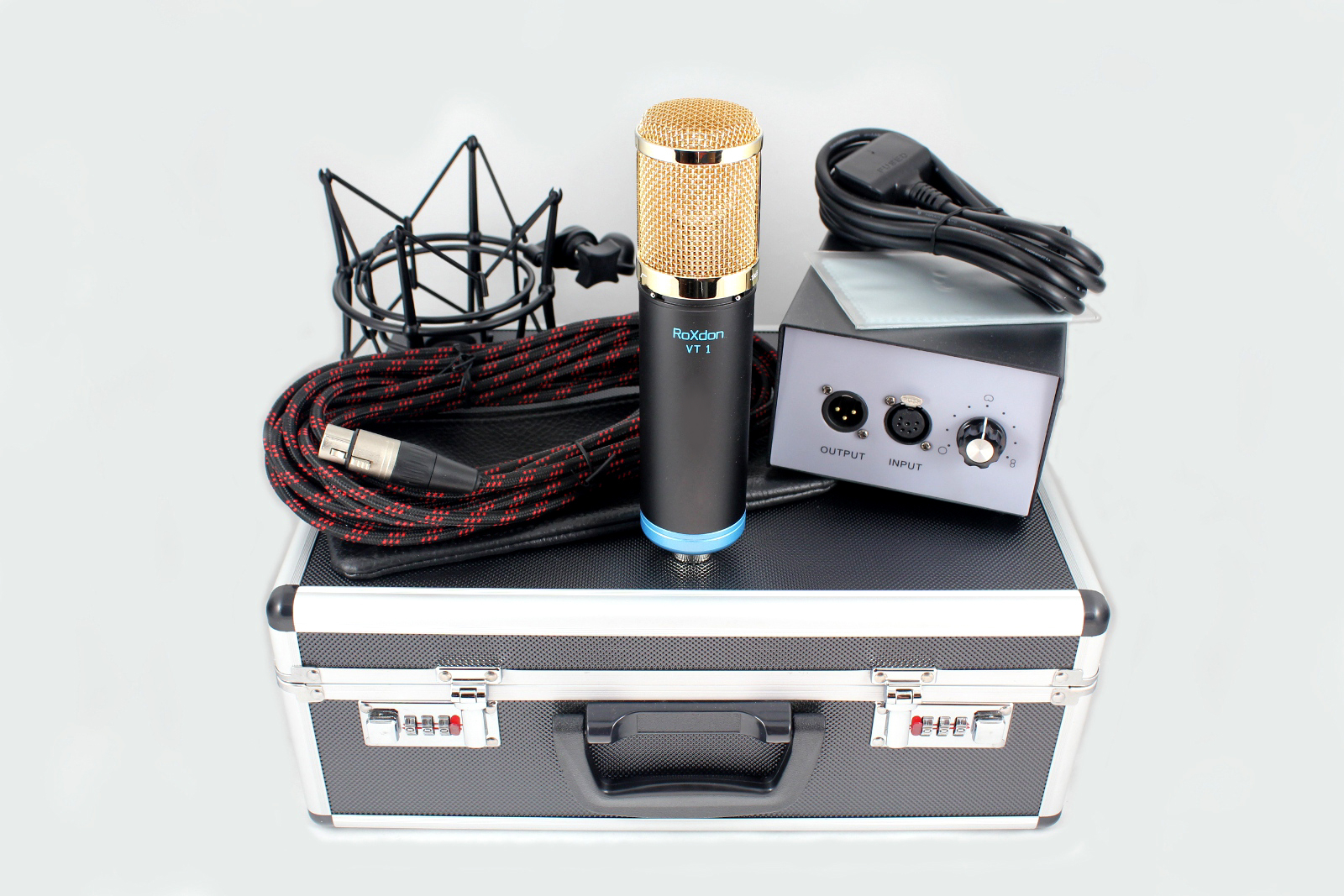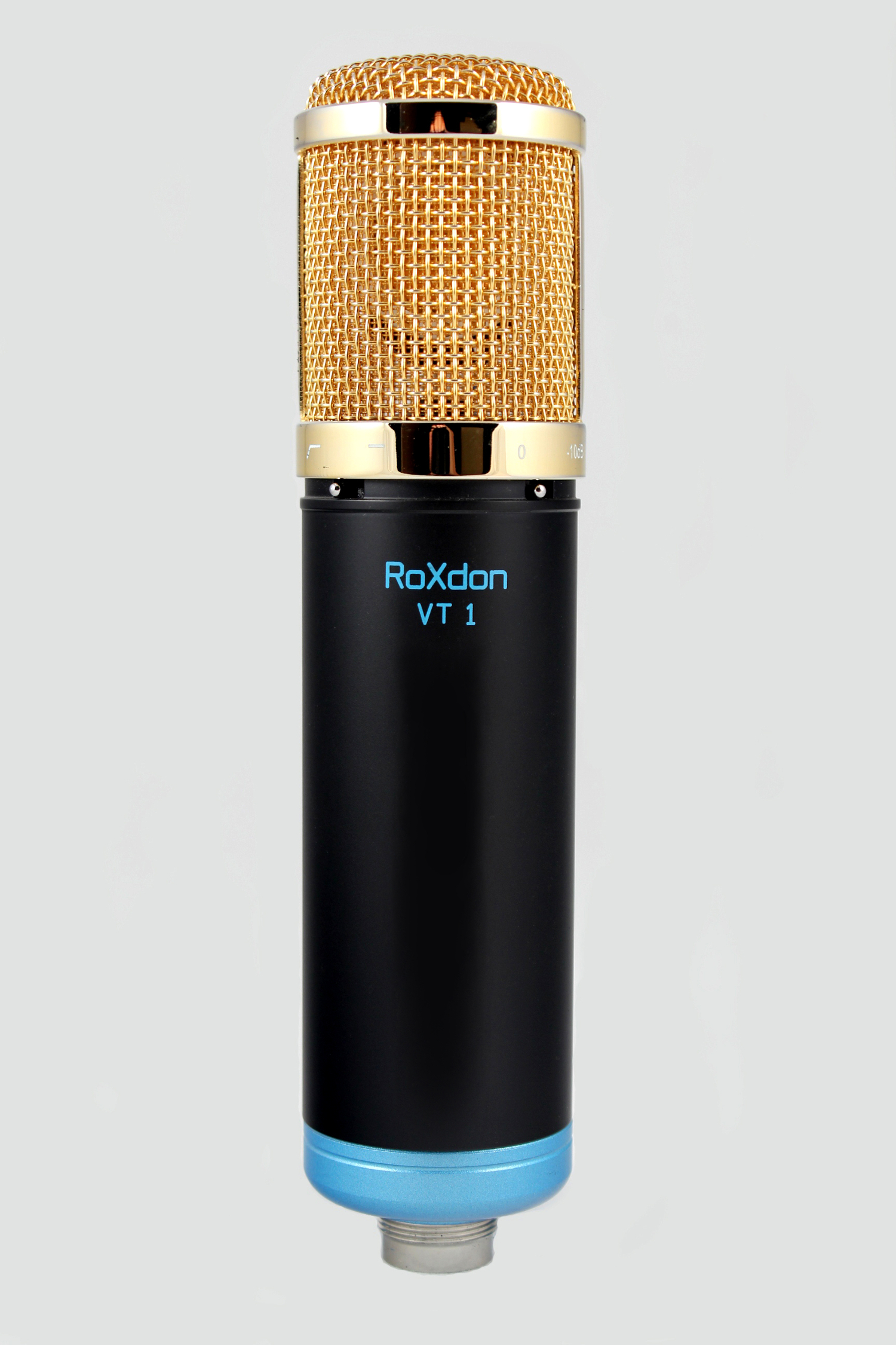 microphone. The RoXdon VT-1 features nine variations of polar pattern from Omni, Cardioid and Figure of 8, and is achieved by adjusting the variable control on the power supply. There also features a low cut filter switch and -10dB attenuation switch located conveniently on the microphone body. The RoXdon VT-1 microphone has very low self noise, good signal to noise ratio and excellent audio dynamic range. The RoXdon VT-1 microphone and accessories are supplied in a practical aluminium storage case. The accessories include a vintage style shock mount; dedicated phantom power supply; RoXdon 7-core microphone cable and a micro-fibre microphone polishing cloth. Finished in a non-reflective egg shell black with luxurious gold grille, the RoXdon VT-1 exudes class. SPECIFICATION